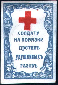 1915(?) г. Разм. 37 х 56 мм. Двухцветная двухсторонняя печать на сероватой бумаге. На лицевой стороне в декоративной рамке разм. 33 х 51 мм сверху красный крест. В центре текст в пять строк: «Солдату на повязки от удушливых газов». На оборотной стороне в такой же рамке сверху красный крест. Ниже …
