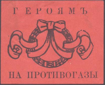 1915(?) г. Разм. 68 х 56 мм. Одноцветная печать на красной бумаге. В центре венок с лентами. Сверху текст: «Героям». Внизу продолжение текста: «На противогазы».