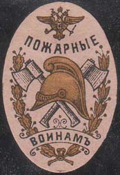 1915 г. 17.12.1915 г. Овал разм. 28 х 43 мм. Двухцветная печать на бумаге различных цветов. В центре в обрамлении венка каска пожарного на фоне скрещенных пожарных топориков. Сверху герб России и текст: «Пожарные». Внизу продолжение текста: «Воинам».