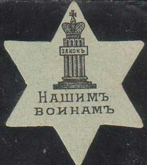 1915(?) г. Виньетка в виде шестиконечной звезды разм. 34 х 40 мм. Одноцветная печать на зелено-серой бумаге. В центре эмблема судебного ведомства, внизу текст в две строки: «Нашим воинам».