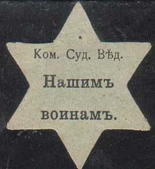 1915(?) г. Виньетка в виде шестиконечной звезды разм. 34 х 40 мм. Одноцветная печать на зелено-серой бумаге. В центре текст в три строки: «Ком[итет]. Суд[ебного]. Вед[омства]. Нашим воинам».