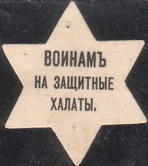 1915(?) г. Виньетка в виде шестиконечной звезды разм. 34 х 40 мм. Одноцветная печать на белой бумаге. В центре текст в три строки: «Воинам на защитные халаты».