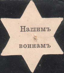 1915(?) г. Виньетка в виде шестиконечной звезды разм. 34 х 40 мм. Одноцветная печать на белой бумаге. В центре текст в две строки: «Нашим воинам».