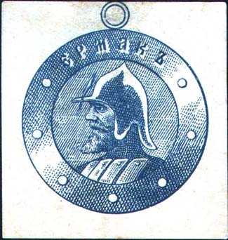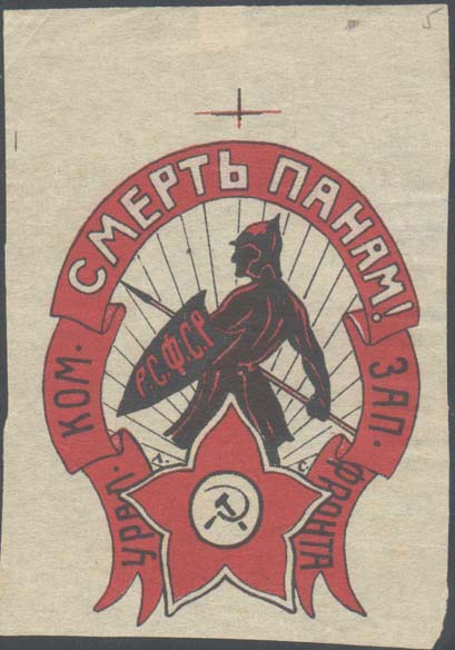 1920 г. Разм. ≈ 65 х 82 мм. Двухцветная печать на тонкой сероватой (оттенки) бумаге. В центре в лучах восходящего солнца аллегорическое изображение красноармейца с копьем и щитом. На щите аббревиатура «Р.С.Ф.С.Р.». На ленте полукругом текст: «Урал[ский]. Ком[итет]. Зап[адного]. Фронта. Смерть пан…