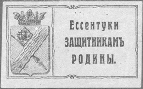 1917 г. Разм. рамки 73 х 40 мм. Одноцветная печать на розовой бумаге. В прямоугольной декоративной рамке слева герб Терской области, справа текст в три строки: «Ессентуки защитникам Родины».