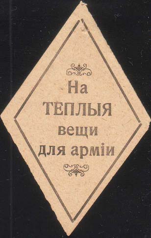1915(?) г. Ромб разм. 53 х 80 мм. Одноцветная печать на желтоватой бумаге. В рамке в форме ромба разм. 45 х 70 мм в центре текст в четыре строки: «На теплые вещи для армии». Сверху и снизу декоративные элементы.