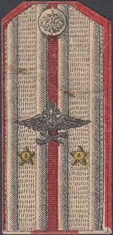 1916 г. Виньетка в виде погона разм. 27 х 56 мм. Одноцветная и трехцветная печать на белой бумаге. Погон подпоручика с авиационным значком. Сбор на аэроклуб.