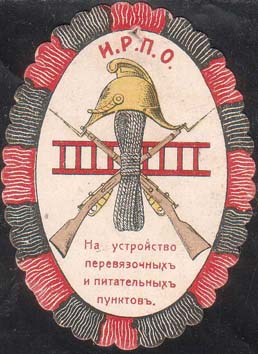1915(?) г. Виньетка в виде овала разм. 43 х 58 мм. Много-цветная печать на плотной глянцевой белой бумаге. В декоративной овальной рамке в центре скрещенные винтовки, моток веревки и лестница. Выше пожарная каска. Сверху аббревиатура «И.Р.П.О.». Внизу текст в четыре строки: «На устройство перевяз…