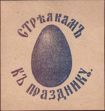 1914 г. 05.-06.05 1914 г. Разм. 57 х 60 мм. Одноцветная печать на плотной кремовой бумаге. В центре пасхальное яйцо. Сверху и снизу полукругом текст: «Стрелкам к празднику».