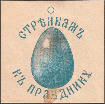 1915(?) г. Разм. 58 х 57 мм. Одноцветная печать на плотной кремовой бумаге. В центре пасхальное яйцо. Сверху и снизу полукругом текст: «Стрелкам к празднику». Сверху кружок для обозначения места прокола булавкой для крепления.