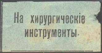 1915(?) г. Разм. 56 х 28 мм. Одноцветная печать на светло-зеленой бумаге. В центре текст в две строки: «На хирургические инструменты».