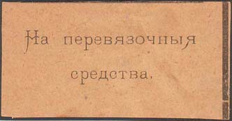1915(?) г. Разм. 55 х 28 мм. Одноцветная печать на желто-серой бумаге. В центре текст в две строки: «На перевязочные средства».