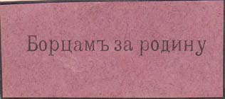 1915(?) г. Разм. 55 х 28 мм. Одноцветная печать на розово-фиолетовой бумаге. В центре текст: «Борцам за родину».