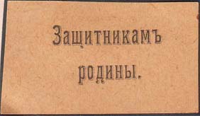 1915(?) г. Разм. 55 х 28 мм. Одноцветная печать на желтой бумаге. В центре текст в две строки: «Защитникам Родины».