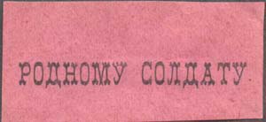 1915(?) г. Разм. 55 х 28 мм. Одноцветная печать на розовой бумаге. В центре текст: «Родному солдату».