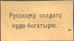1915(?) г. Разм. 55 х 28 мм. Одноцветная печать на желтой бумаге. В центре текст в две строки: «Русскому солдату чудо-богатырю».