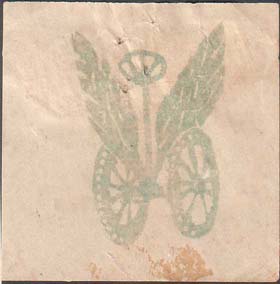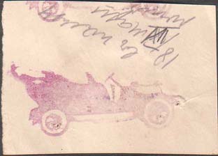 1918 г. 18.04.1918 г. Разм. 52 х 37 мм. Одноцветная двухсторонняя печать на белой бумаге. На лицевой стороне красно-фиолетовый оттиск ручного штампа с изображением автомобиля. На оборотной стороне розовый оттиск ручного штампа с эмблемой автомобильных частей. Сбор в пользу маршевых рот.