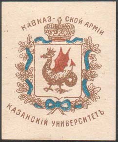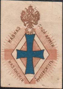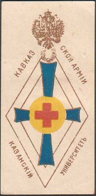 1914 г. Разм. 35 х 55 мм. Трехцветная печать на белой бумаге. В центре знак выпускника университета на фоне красного креста. Текст: «Казанский университет Кавказской армии».