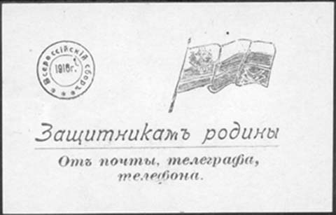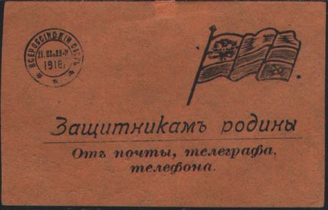 1916 г. Всероссийский сбор. Разм. 82 х 52 мм. Одноцветная печать на тонкой бумаге различных цветов. Сверху справа флаг Главного управления почт и телеграфов, слева в круге дата: «1916 г.». По окружности текст: «Всероссийский сбор». Внизу текст в три строки: «Защитникам Родины от почты, телеграфа, …