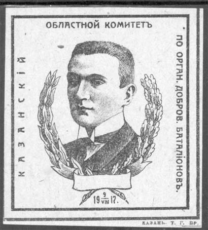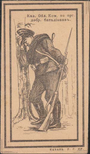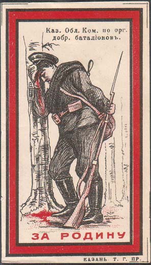 1917 г. Разм. рамки 45 х 81 мм. Двухцветная печать на белой бумаге. В двойной рамке в центре раненый солдат прислонился к дереву. Сверху текст в две строки: «Каз[анский]. Обл[астной]. Ком[итет]. По орг[анизации]. Добр[овольческих]. батальонов». Внизу текст: «За Родину». Слева внизу под рамкой вых…
