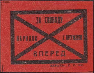 1917 г. Разм. рамки 46 х 32 мм. Одноцветная печать на красной бумаге. Рамка разделена диагональными полосами на четыре части. Текст: «За свободу народов с оружием вперед». Слева внизу под рамкой выходные данные мелким шрифтом: «Казань Т.Г.Пр.».