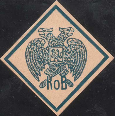 1916 г. 11.05.1916 г. Ромб разм. 66 х 66 мм. Одноцветная печать на светло-серой бумаге. В центре эмблема общества(?): двуглавый орел с гербом Казани на груди, держащий в лапах два авиационных винта. Внизу аббревиатура «КОВ».