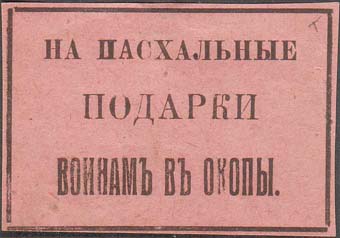 1915(?) г. Разм. рамки 55 х 37 мм. Одноцветная печать на розовой бумаге. В центре в прямоугольной рамке текст в три строки: «На пасхальные подарки воинам в окопы».
