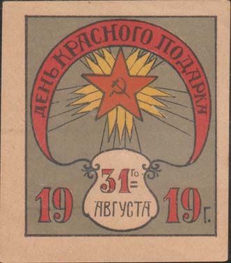 1919 г. 31.08.1919 г. 1919 г. (31.08.1919 г.). Разм. 45,5 х 53 мм. Трехцветная печать на сероватой бумаге. В центре звезда с серпом и молотом. Сверху на ленте текст: «День красного подарка». Внизу дата: «31 августа 1919 г.».