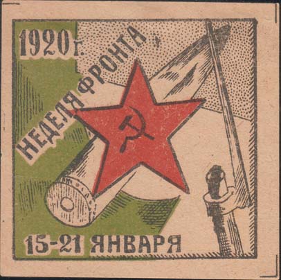 1920 г. 15.21.01.1920 г. Разм. рамки 57 х 57 мм. Трехцветная печать на толстой кремовой бумаге. В рамке в центре пятиконечная звезда и винтовочный патрон. Справа внизу часть ствола винтовки со штыком. В левом верхнем углу дата: «1920». Ниже по диагонали слева направо текст: «Неделя фронта». Внизу …