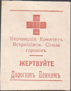 1916 г. Разм. 39 х 52 мм. Одноцветная печать на желтоватой бумаге. В двойной декоративной рамке сверху красный крест. В центре текст в три строки: «Керченский Комитет Всероссийского Союза Городов». Ниже текст в две строки: «Жертвуйте Дорогим Воинам».