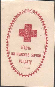 1915(?) г. Разм. 30 х 48 мм. Двухцветная печать на белой бумаге. В центре в овальной декоративной рамке в центре красный крест. Внизу текст в три строки: «Керчь на красное яичко солдату».