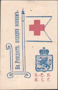 1916 г. Разм. 38 х 58 мм. Двухцветная печать на белой бумаге. Слева флажок с красным крестом. Па-раллельно древку флага текст: «На Рождеств[енские]. Подарки воинам». Слева внизу герб г. Керчь. Внизу аббревиатура «К.-Е.К.В.С.Г.».