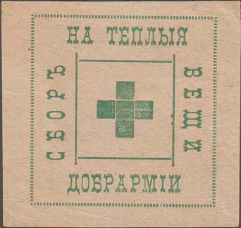 1919(?) г. Разм. рамки 54 х 57 мм. Одноцветная печать на серо-зеленой бумаге. В центре в прямоугольной рамке разм. 46 х 45 мм красный крест. По периметру текст: «Сбор на теплые вещи для Добрармии».