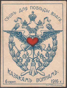 1916 г. 06.09.1916 г. Разм. рамки 42 х 55,5 мм. Двухцветная печать на кремовой бумаге. В центре знак общества. Сверху текст в две строки: «Сбор для победы врага». Внизу полукругом текст в две строки: «Казакам воинам 6 сент[ября]. 1916 г.». Справа внизу под рамкой мелким шрифтом выходные данные: «Л…