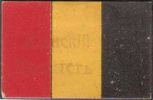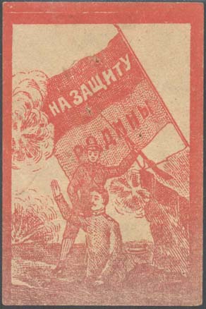 1917 г. Разм. 48 х 73 мм. Одноцветная печать на желтой бумаге. В центре двое солдат на фоне флага России и разрывов снарядов. На знамени текст в две строки: «На защиту Родины».