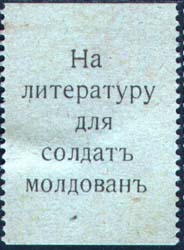 1915(?) г. Разм. 30 х 41 мм. Одноцветная печать на бумаге различных цветов. Вертикальная зубц. 11 1/2. В центре текст в пять строк: «На литературу для солдат молдаван».