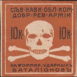1918 г. Разм. 64 х 42 мм. Двухцветная печать на плотной белой бумаге. В прямоугольной рамке 37 х 37 мм в центре череп со скрещенными костями и номинал. По бокам номинал. Сверху текст в две строки: «Сев[еро]. Кавк[азский]. обл[астной]. ком[итет]. Добр[овольческой]. рев[олюционной]. Армии». Внизу т…