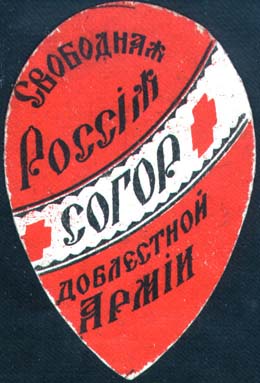 1917 г. Виньетка в виде овала, заостренного в нижней части рамки 42 х 64 мм. Двухцветная печать на толстой белой бумаге. По диагонали лента с аббревиатурой «СОГОР» и двумя красными крестами по краям. Сверху текст: «Свободная Россия». Внизу текст: «Доблестной армии».