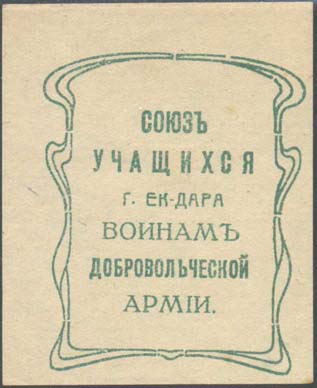 1919 г. Разм. 53 х 64 мм. Одноцветная печать на белой бумаге. В декоративной фигурной рамке разм. 44 х 54 мм текст в шесть строк: «Союз учащихся г. Екатеринодара воинам Добровольческой армии».