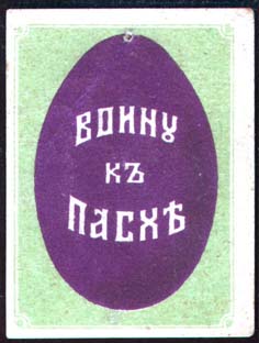 1915(?) г. Разм. рамки 33,5 х 46,5 мм. Двухцветная печать на плотной белой бумаге. В прямоугольной рамке с декоративными углами на цветном фоне в центре пасхальное яйцо. На яйце текст в три строки: «Воину к Пасхе».