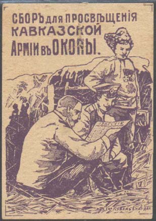 1915(?) г. Разм. 51 х 72 мм. Одноцветная печать на желтоватой бумаге. В центре двое солдат читают газету, третий стоит рядом с книгой. Сверху текст в три строки: «Сбор для просвещения Кавказской Армии в окопы». Внизу справа мелким шрифтом выходные данные: «Лит. Т-ва «Кубань» Екатдар».