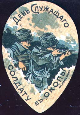 1916 г. 17.04.1916 г. Виньетка в виде овала, заостренного в нижней части разм. 43 х 73 мм. Трехцветная печать на белой бумаге. В центре два солдата с винтовками в окопе. Сверху полукругом текст: «День Служащего». Внизу текст: «Солдату в окопы». Справа параллельно кромке знака мелким шрифтом выходн…
