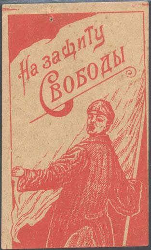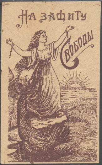 1917 г. Разм. 53 х 82 мм. Одноцветная печать на желтой бумаге. В центре аллегорический рисунок. Женщина с разорванными кандалами на руках, символизирующая свободную Россию, с орлом у ног, символизирующим самодержавие. Сверху текст в две строки: «На защиту свободы».