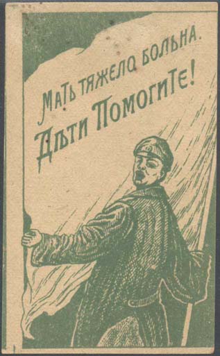 1917 г. Разм. рамки 48 х 81 мм. Одноцветная печать на желтой бумаге. В прямоугольной рамке солдат со знаменем в правой руке. На знамени текст в две строки: «Мать тяжело больна. Дети Помогите!».
