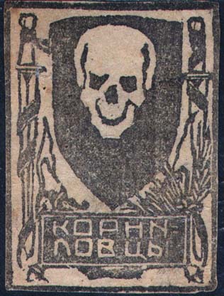 1919(?) г. Разм. 50 х 69 мм. Одноцветная печать низкого качества на тонкой серой бумаге. В прямо-угольной рамке в центре на фигурном щите эмблема Корниловцев. По краям щита два меча перевитых лентами. Внизу в двойной прямо-угольной рамке текст в две строки: «Корниловцы».
