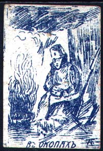 1915(?) г. Разм. 32 х 48 мм. Одноцветная печать на желтоватой бумаге с мелованным верхним слоем. Солдат в зимнем обмундировании у костра в окопе с перекрытием. Внизу текст в одну строку: «В окопах».