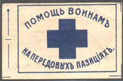 1915(?) г. Разм. рамки 33 х 22 мм. Одноцветная печать на белой бумаге. В центре в прямоугольной рамке синий крест. Сверху и снизу полукругом текст: «Помощь воинам на передовых позициях». Слева стилизованное изображение булавки для креп-ления знака к одежде.