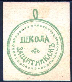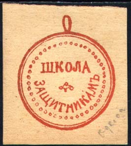 1916 г. Разм. 40 х 47 мм. Одноцветная печать на толстой желтоватой бумаге. В центре круглая медаль диаметром 33 мм с ушком. Текст: «Школа защитникам».