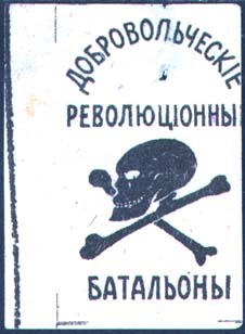 1917 г. Разм. 33 х 51 мм. Одноцветная печать на сероватой бумаге. В центре череп со скрещенными костями. Сверху полукругом текст: «Добровольческие революционные батальоны».