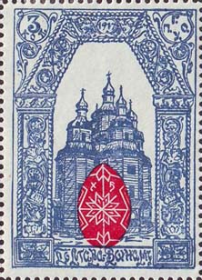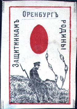 1915(?) г. Разм. рамки 33 х 53 мм. Двухцветная печать на белой бумаге. В прямоугольной рамке в центре пасхальное яйцо. Внизу сидящий солдат с винтовкой и ветки вербы. По периметру рамки текст: «Оренбург защитникам Родины».